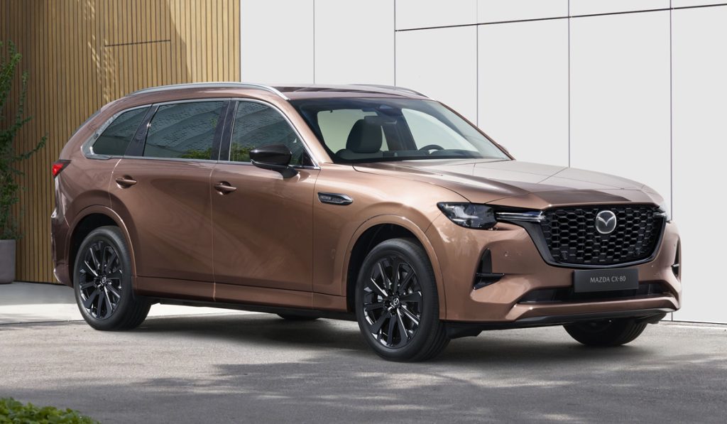 Mazda CX-80, yang menjadi perhatian utama, adalah SUV tiga baris yang ditujukan kepada pembeli segmen premium. Dengan panjang 4,995 mm dan jarak roda 3,120 mm, CX-80 menawarkan ruang kabin yang luas dengan pilihan enam atau tujuh tempat duduk. Interiornya berkongsi elemen reka bentuk dengan CX-60, termasuk skrin infotainmen 12.3 inci, sistem bunyi Bose 12 pembesar suara, dan teknologi seperti Apple CarPlay tanpa wayar. Bersama CX-60, yang disasarkan untuk pembeli SUV lima tempat duduk, Mazda ingin menyaingi model mewah seperti BMW X3 dan Mercedes-Benz GLE.