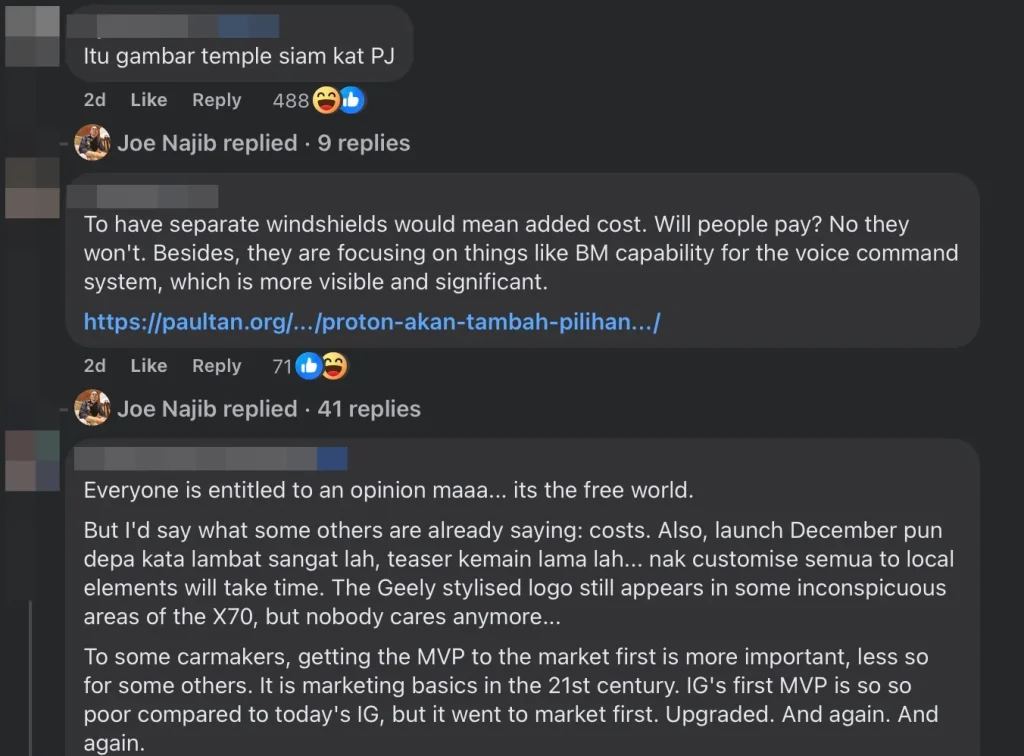 Dalam ruangan komen, rakyat Malaysia memberikan pandangan yang pelbagai. Ada yang bersetuju dengan pendapat Joe, menyatakan bahawa Proton perlu lebih sensitif terhadap elemen yang membentuk identiti kenderaan nasional. Seorang pengguna pula bergurau bahawa logo itu mungkin bukan Bandaraya Hangzhou tetapi kuil Siam yang terletak di Petaling Jaya.