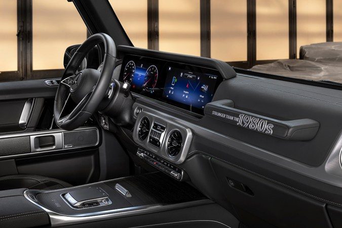 While the exterior reaches back in time, the interior lives firmly in the future. Drivers will enjoy twin 12.3-inch digital screens, a Burmester 3D sound system, a sunroof, and luxurious leather seats. However, classic details appear in cloth-trimmed consoles and seat inserts, subtle retro patterns, and tasteful inscriptions like “Stronger Than the 1980s” on the grab handle. Additional nods include a laser-etched silhouette of the Schöckl mountain—the legendary Austrian testing ground for the G-Class—and a “Schöckl-Proved” badge on the B-pillar.