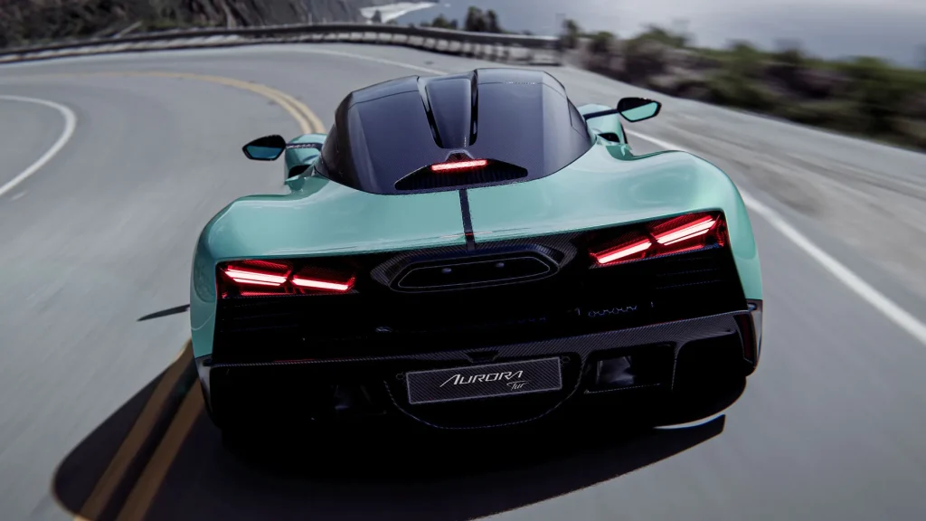 Despite weighing approximately 1,450kg, the Aurora Tur rockets from 0–62mph in just 2.3 seconds, reaches 186mph in nine seconds, and has a claimed top speed of 280mph. This ferocious speed is paired with design elements that reduce drag and optimize underbody airflow, while active aerodynamics enhance high-speed stability. The Tur variant is designed not only for speed but also for long-distance comfort.