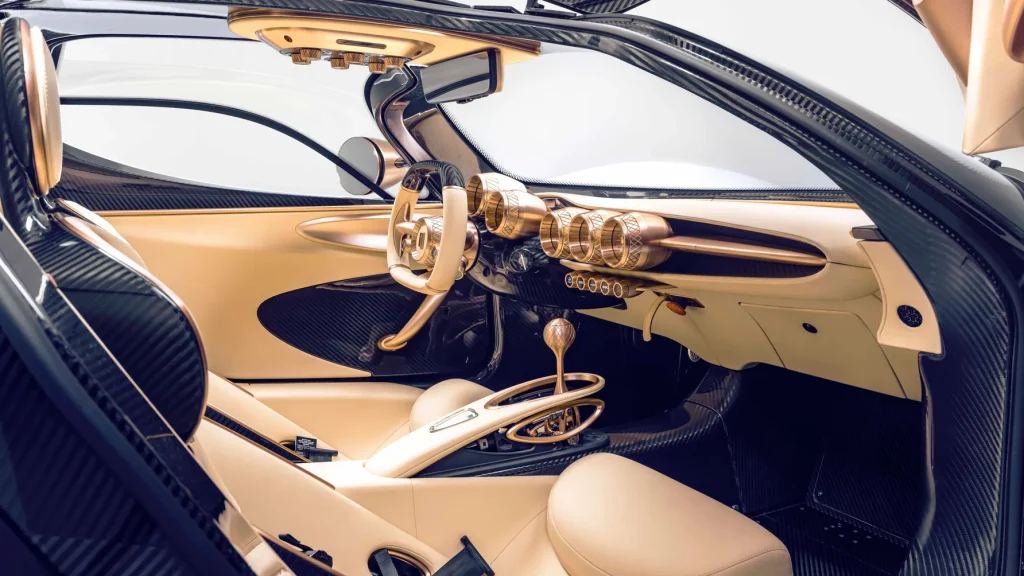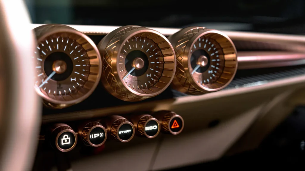Inside, every surface speaks of craftsmanship. There are no screens, no touch panels, and no modern distractions. Instead, the cabin is filled with tactile switches, rotary dials, and even a rev counter that climbs in Roman numerals to “IX”. Finishes vary from brushed to polished to matte metal, sourced from the same supplier behind Bugatti’s Tourbillon hypercar.