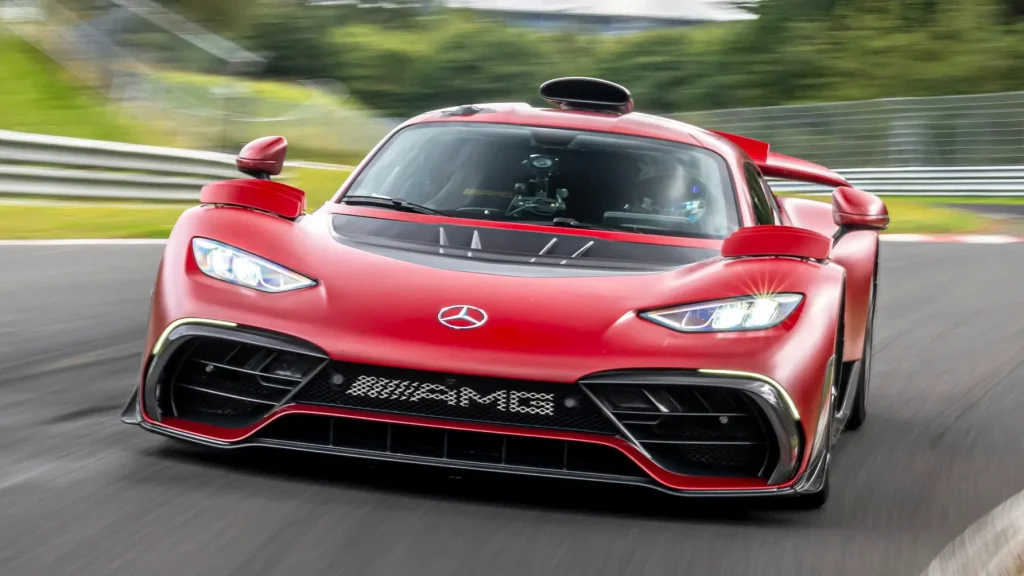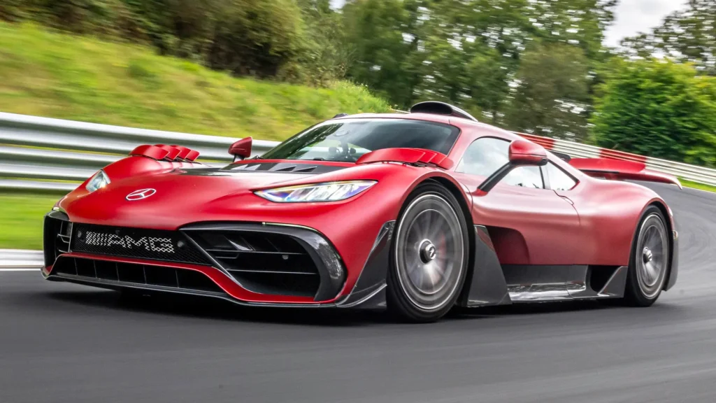The Mercedes‑AMG One generates 782 kW (1,049 hp) from its 1.6‑liter turbocharged V6 paired with four electric motors. Notably, it’s the first road‑legal production car to break the 6:30 mark at the Nürburgring. No other production car has come close on the full 20.832 km configuration.