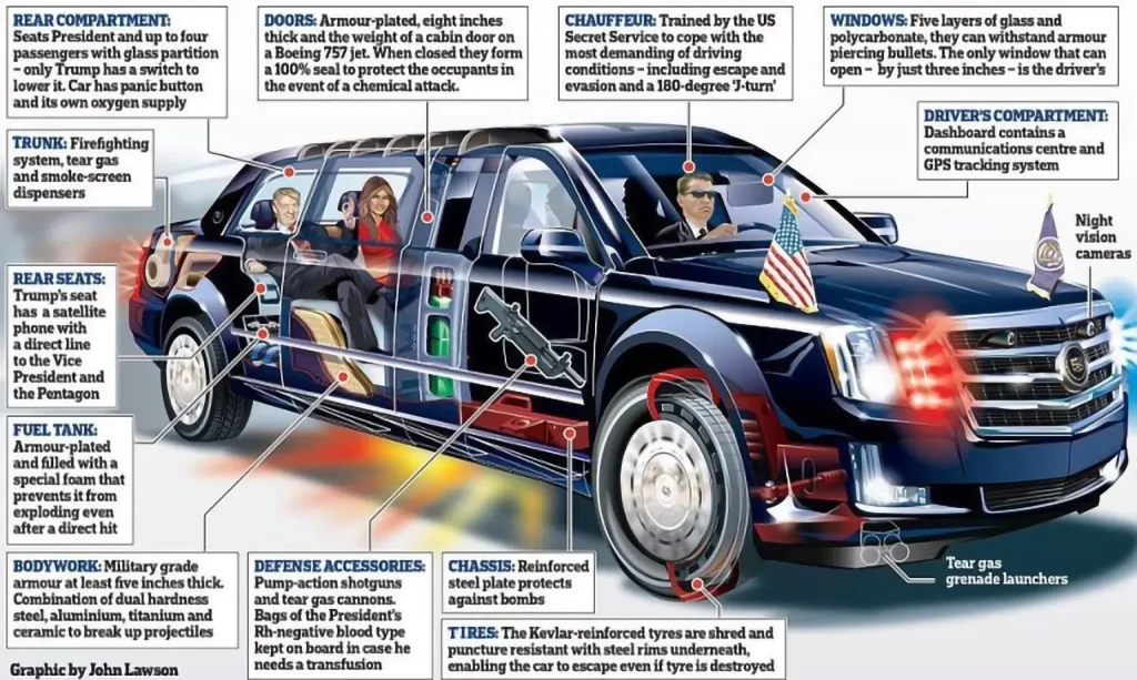 Security lies at the heart of the limousine’s DNA. Though many details remain classified, media reports paint a revealing picture of its formidable defenses. With bullet-resistant doors estimated to be eight inches thick and laminated glass windows around five inches deep, the vehicle lives up to its reputation as an unparalleled fortress on wheels.